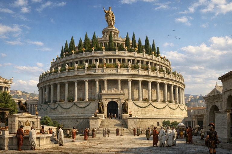 A su vuelta a Roma, Augusto, decide iniciar la construcción de un mausoleo donde depositar sus restos cuando él fallezca, para éste y para todos los familiares y descendientes de su familia, quizás impresionado por lo visto y por ese concepto arrelado en los antiguos, de dejar constancia de su legado personal y político. Y es entonces cuando en la gran planicie del campo de Marte, fuera de las murallas de Roma, Augusto decide construir su mausoleo, el aún visible Mausoleo de Augusto.